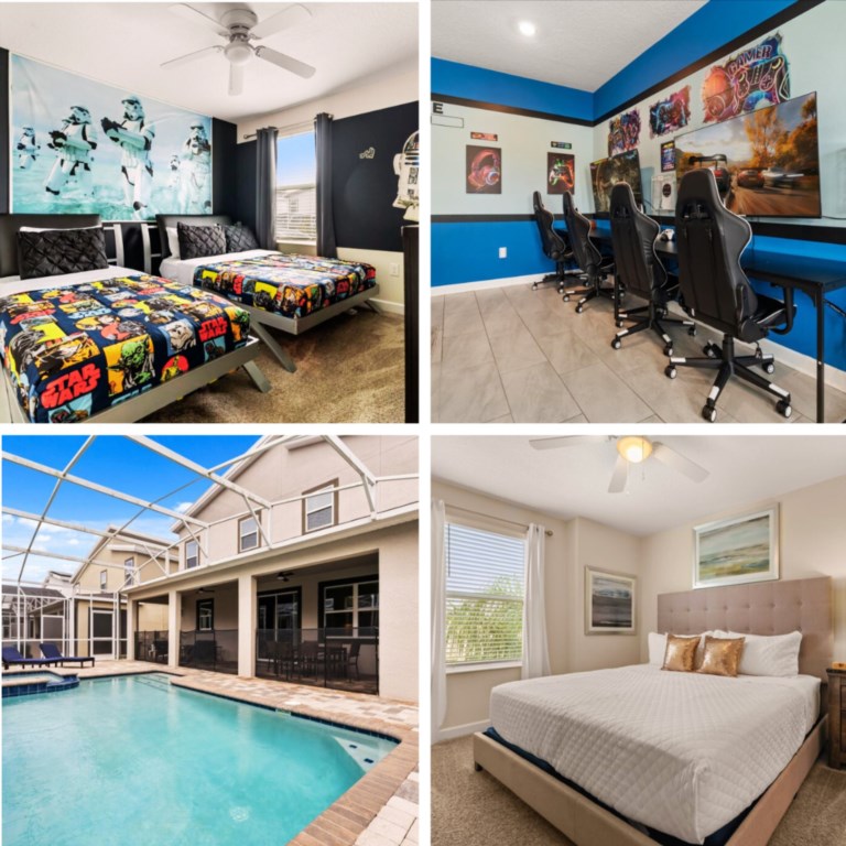 This spacious 7 bedroom, 6 bath pool home offers luxurious and spacious living for families visiting the Orlando area theme parks - it's only a short, 8 mile drive away from Mickey and all his friends, located on the fabulous ChampionsGate Resort. Spend days relaxing on vacation alongside the sparkling clear pool, or step inside to cool down in this fully air-conditioned family vacation home - with games room! Make memories with your family to last a lifetime without breaking the bank! The villa has 4 King Bedrooms 1 Full Bedrooms with twin and one room with twin beds and alll rooms have cable tv and flatscreen tvs At-A-Glance: * Pool with sun deck & shaded lanai * Contemporary furnishings & decor * Full kitchen with granite counters & stainless appliances * Laundry with washer and dryer * Family games room with pool table * Foosball table, & air-hockey game * Flat screen HDTV in every bedroom * WiFi high speed internet provided FREE * Local & long-distance (US) calls FREE * Resort clubhouse with 2 pools & lazy river * Resort water park with splash-zone & cabanas * Resort poolside tiki bar * Resort water park hot tub * Clubhouse bar & restaurant